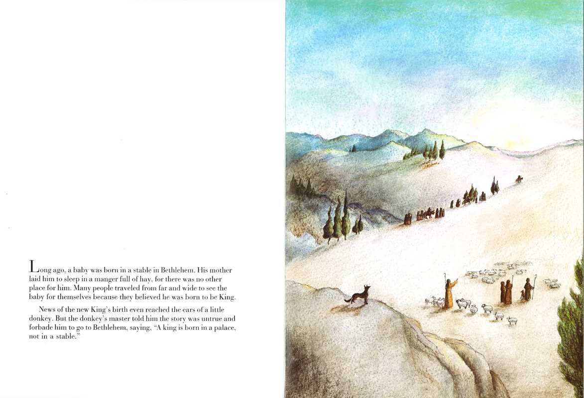 Along the way he is sneered at by a camel and laughed at by the other animals. Feeling worthless, he begins to stumble and lose heart until a great light guides him to his destination. There he is rewarded for his courage and faith, and learns that the new king loves all creatures.