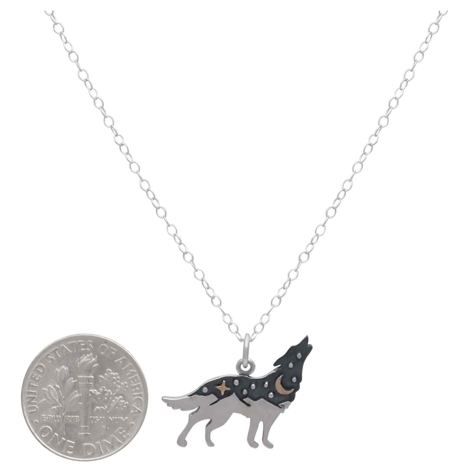 This sterling silver wolf necklace with bronze star and moon enchants. Because of their fierce spirit & success as hunters, wolves are about survival and loyalty to their pack. Every wolf instinctually does its part to help the whole. Comes on a simple sterling silver 18" cable chain with a spring ring clasp, adjustable to 16". The charm measures 18x19mm, excluding jumprings. · Made from Recycled Sterling Silver.