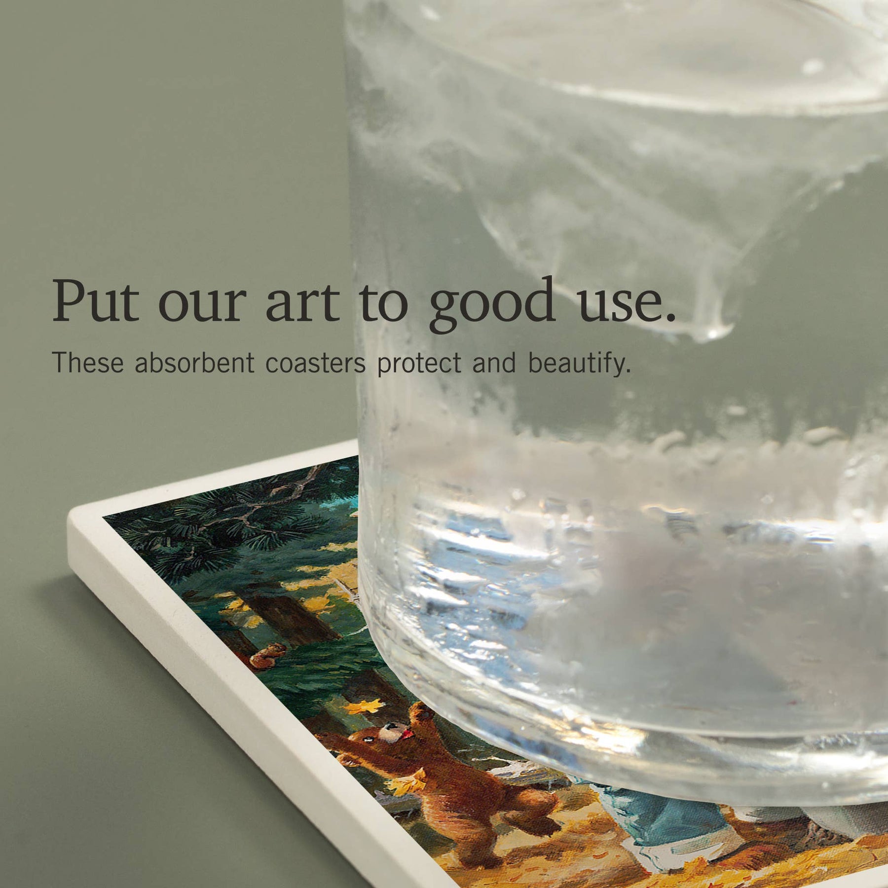 Our Ceramic Coasters feature artwork on quality materials in vibrant full color. We use eco-friendly ink and packaging, sourced responsibly and planet friendly. Printed in USA, supporting domestic production. • 4" x 4" • Highly absorbent ceramic • Cork-backed to protect surfaces • Printed in the USA with eco-friendly and fade-resistant inks