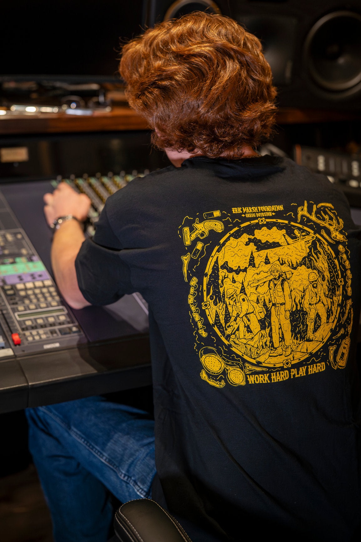 Crafted from 100% cotton, this unisex tee delivers all-day comfort with a bold statement of balance: work with purpose, and live with passion. Featuring a striking “Work Hard Play Hard” graphic and a subtle Eric Marsh Foundation emblem, it’s perfect for both duty days and well-earned downtime. Artist: Gregg Boydston